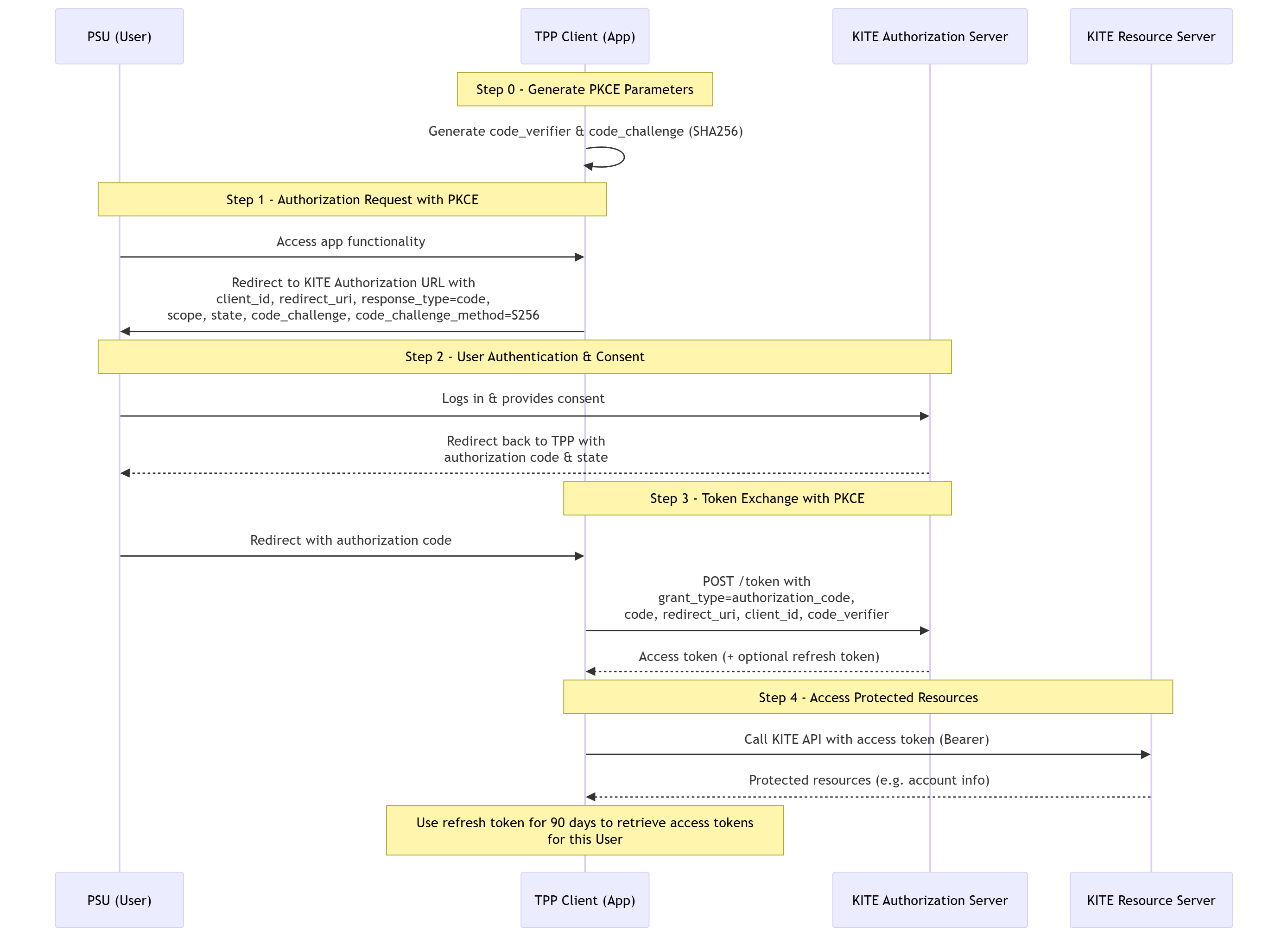 Kite PSD2 flow for AIS, including consent creation, PSU approval, token exchange and subsequent AIS API calls